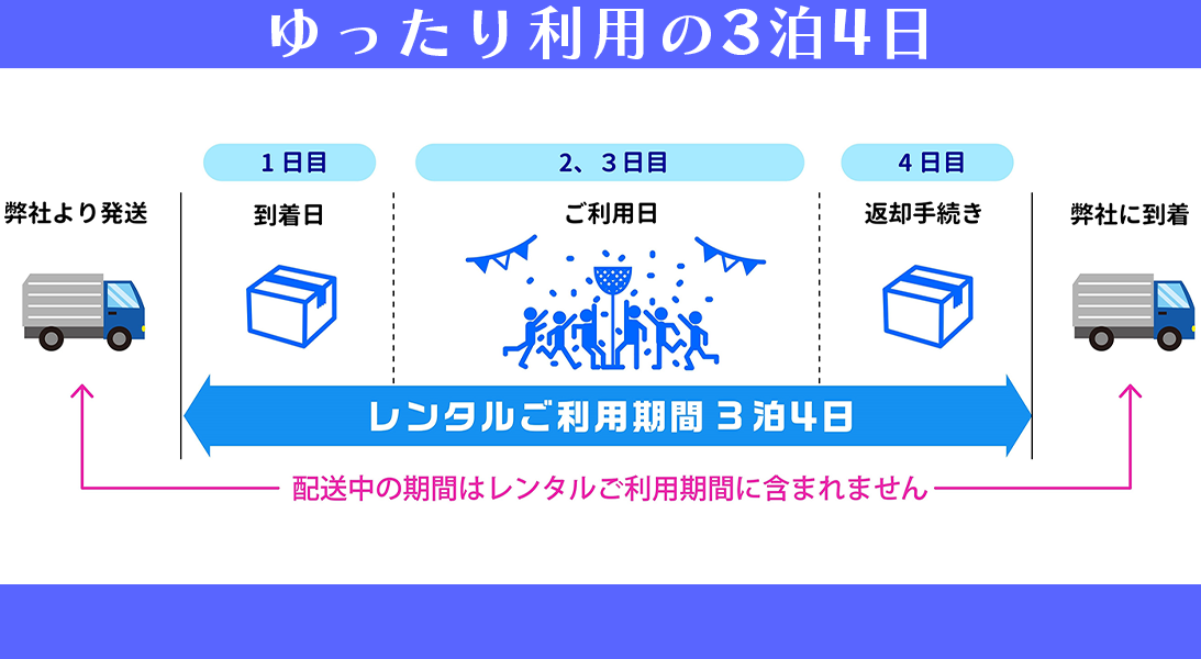 また、お盆期間中のレンタル品の返却に関しては、配送業者の都合により延泊が発生した場合でも